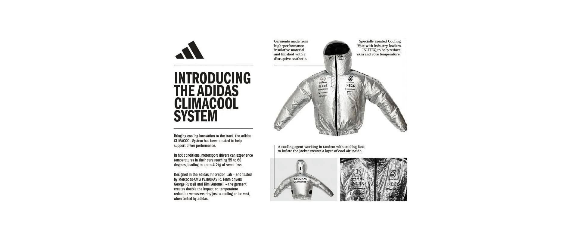 We worked closely with adidas’ innovation team to translate the initial design intent into technical patterns, source and test suitable materials, and produce fully functional insulated garments and cooling vests ready for athlete testing. Every detail was executed with precision to meet the performance demands of Formula 1 and the exacting standards of the adidas team.